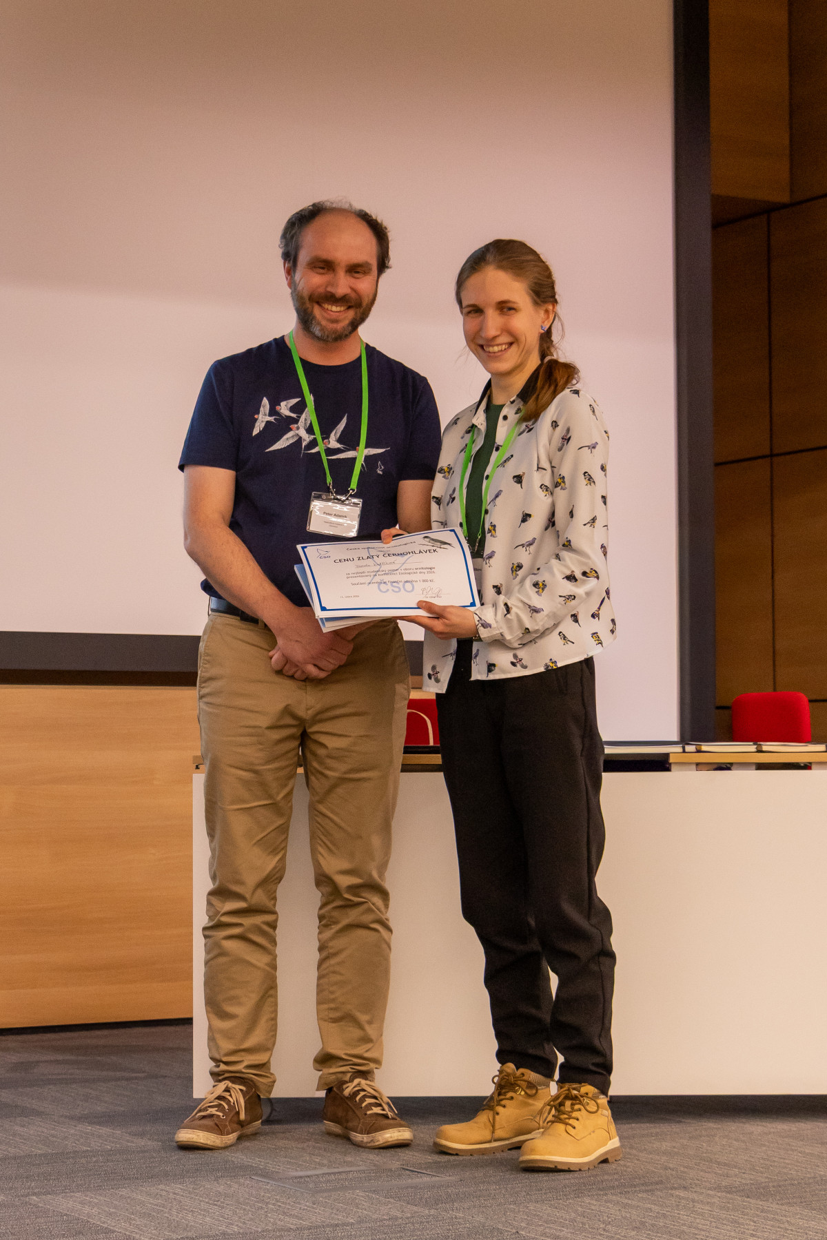 Dorota Kudělková, studentka oboru zoologie, se svým posterem „Ptáci moravských luhů a hájů: analýza ptačích společenstev lužních lesů střední Moravy“, založeném na výsledcích své bakalářské práce, získala hned dvě ocenění – 2. místo za nejlepší studentský poster a cenu České společnosti ornitologické. V listopadu loňského roku už ale Dorota bodovala se stejným posterem na Konferenci k příležitosti 35. výročí vzniku CHKO Litovelské Pomoraví a Katedry ekologie a životního prostředí, kde získala 3. místo. K získaným oceněním gratulejeme a přejeme další vědecké úspěchy!